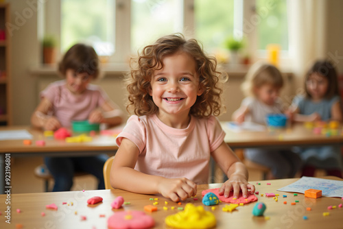 Fototapeta premium Smiling four year old girl playing with playdough in kindergarten classroom