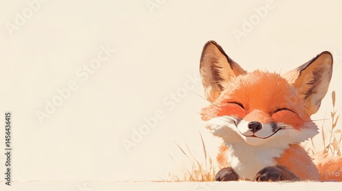© Fridocha, Obraz premium Smiling fox with fluffy fur sits amid tall grass on an off-white background