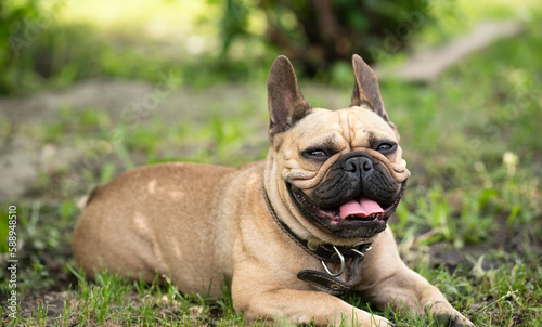 © penyushkin, Obraz premium Smiling french bulldog lying on green grass