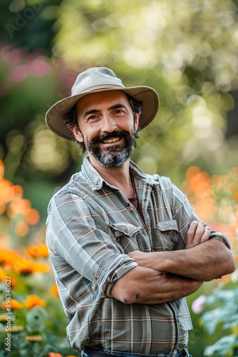 © dreamdes, Obraz premium Smiling gardener in lush garden background. Gardening and horticulture concept. Sustainable living. Banner, advertisement, poster