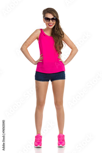 © studioloco, Fototapeta premium Smiling Girl In Pink Shirt. Full length studio shot isolated on white.