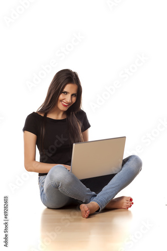 © vladimirfloyd, Naklejka premium smiling girl sitting on the floor and working on laptop
