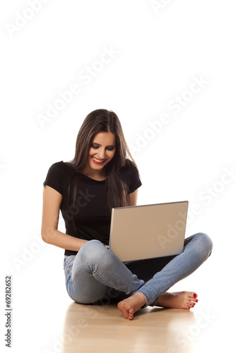 © vladimirfloyd, Naklejka premium smiling girl sitting on the floor and working on laptop