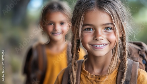 © Fridocha, Obraz premium Smiling girls hiking on forest trail with backpacks