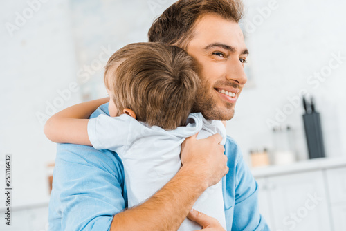 Fototapeta premium smiling handsome father hugging preschooler son at home