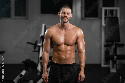 © Vladimir, Fototapeta premium Smiling handsome muscular male athlete in gym