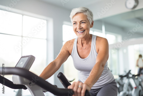 © Jasmina, Obraz premium Smiling happy healthy fit slim senior woman with grey hair practising indoors sport with group of people on an exercise bike in gym.