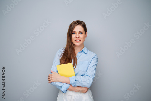 Fototapeta premium Smiling happy teacher woman or student girl with yellow book.