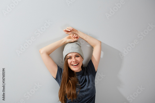 Fototapeta premium Smiling happy woman in casual teenage style leaning against wall and raised arms up. Female studio portrait.