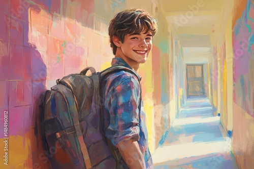 Obraz premium Smiling high school boy with backpack in bright corridor