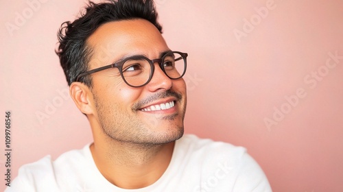 © WS Studio 1985, Fototapeta premium Smiling Hispanic Man with Glasses Posing Against a Pink Background