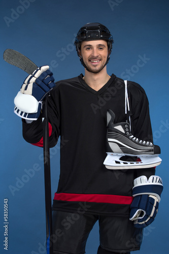 © BlueSkyImages, Fototapeta premium Smiling hockey player with skates over shoulder