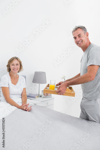 Obraz premium Smiling husband bringing breakfast in bed to wife