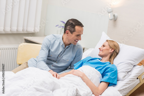 Fototapeta premium smiling husband sitting at wife bed in hospital