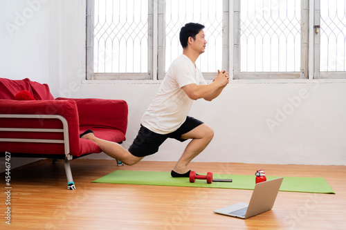 © jittawit.21, Fototapeta premium smiling indian man with fitness tracker exercising and doing squats at home