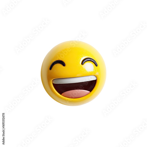 © yaqin, Fototapeta premium Smiling, laughing emoji. Round yellow face with happy expression