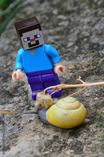 Fototapeta premium Smiling LEGO Minecraft figure of Steve meets Common garden snail with yellow...