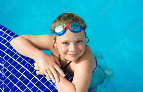 Naklejka premium Smiling little girl in swimming goggles in the swimming pool