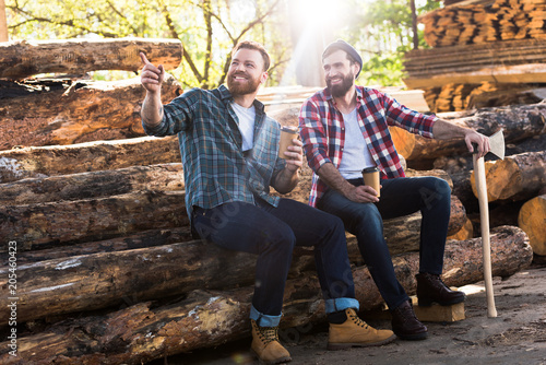 Fototapeta premium smiling lumberjack with coffee cup pointing by finger to partner with axe sitting on logs at sawmill