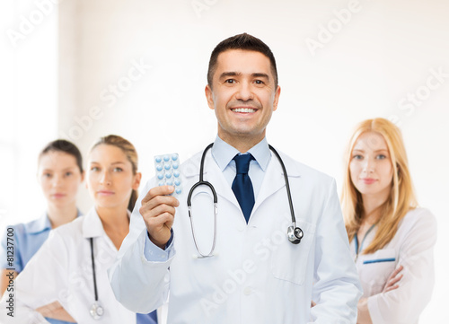 Fototapeta premium smiling male doctor in white coat with tablets