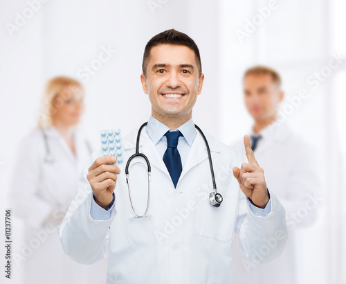 Fototapeta premium smiling male doctor in white coat with tablets