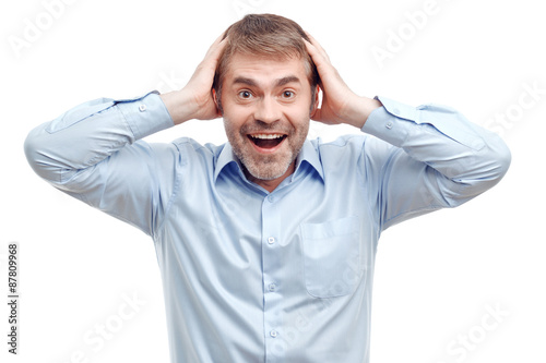 Fototapeta premium Smiling male holding his head.