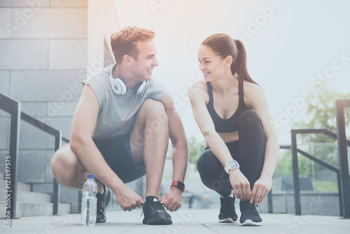 Obraz premium Smiling man and woman tying shoelaces together