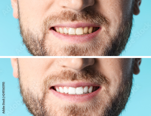 © New Africa, Obraz premium Smiling man before and after teeth whitening procedure on color background, closeup