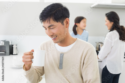 © lightwavemedia, Fototapeta premium Smiling man drinking coffee with family in background