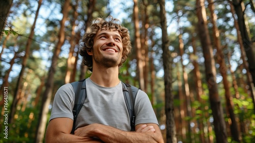 © OKAN, Obraz premium Smiling Man Enjoying a Sunny Day in the Forest