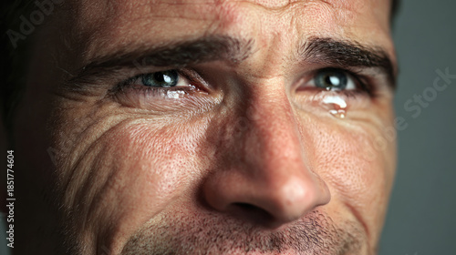 Fototapeta premium Smiling man hides pain behind joyful expression concept. A man expressing deep emotions with tears in his eyes.