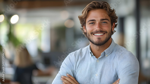 © Siasart Stock, Fototapeta premium Smiling man in a modern office setting with crossed arms.