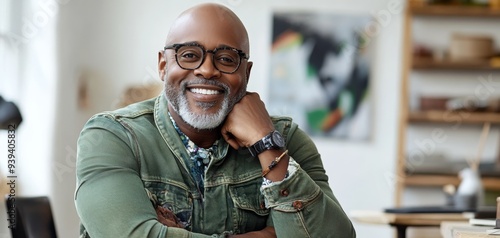 © Amara, Fototapeta premium Smiling Man in Glasses CloseUp Portrait Warm Lighting Denim Jacket Relaxed Confidence