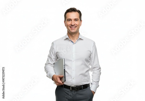 Fototapeta premium Smiling man in shirt holding laptop under arm against white background