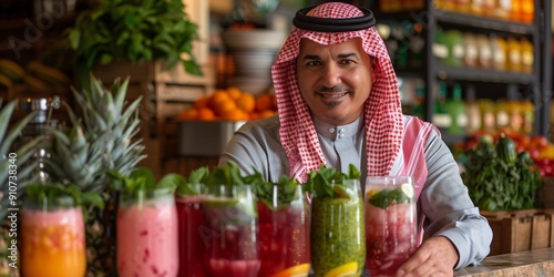 Fototapeta premium Smiling Man in Traditional Attire Presenting Refreshing Drinks