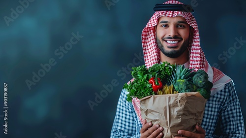 © Qory, Fototapeta premium Smiling Man in Traditional Clothing Holding Groceries