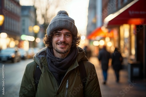 © Zickert Media, Fototapeta premium Smiling Man in Winter Attire on Urban Street at Dusk