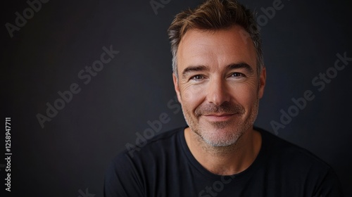 © scrdy, Naklejka premium Smiling Man Portrait: Warmth in a Dark Background