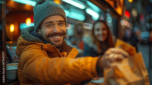 © fotofabrika, Obraz premium Smiling Man Reaches for Food in a City Night Market