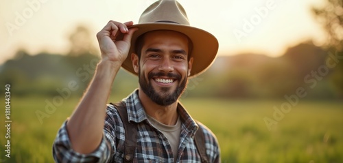 © Maryna, Obraz premium Smiling man wearing hat and plaid shirt in field. Farmer outdoors at sunset, gentle sunlight. He gestures toward his hat with a friendly, warm expression.