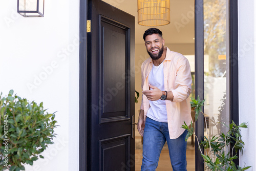 Obraz premium Smiling man welcoming friends at front door, standing in doorway of home,...