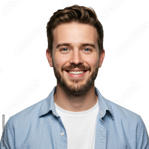 © Shahnaj, Fototapeta premium Smiling man with beard wearing light blue shirt headshot portrait against dark backdrop transparent background