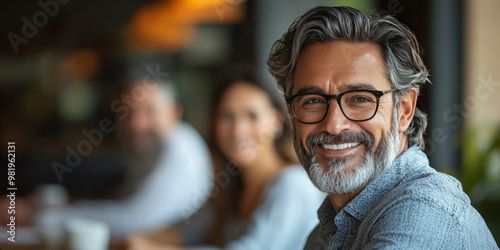 © Vertigo Images, Obraz premium Smiling man with grey hair and beard in a casual setting.