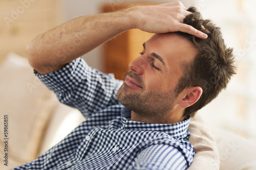 Obraz premium Smiling man with hand in hair