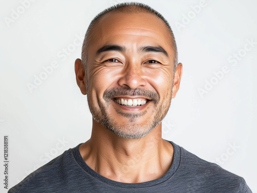 © eliyashevskiy, Obraz premium Smiling Man With Short Hair and Beard Poses Against Plain Background in a Casual Setting