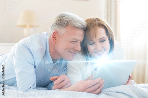 © MDBPIXS, Obraz premium Smiling mature couple sharing digital tablet while lying on bed at home