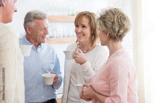 © MDBPIXS, Obraz premium Smiling mature friends holding drinks while talking in living room at home