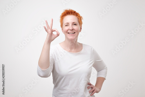 Fototapeta premium Smiling mature lady in white t-shirt gesturing perfect sign