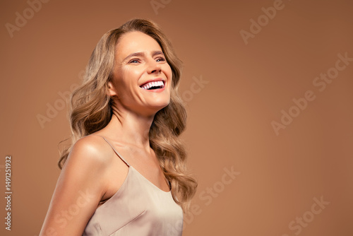 Fototapeta premium Smiling mature woman with beautiful blonde hair and elegant beige outfit,...