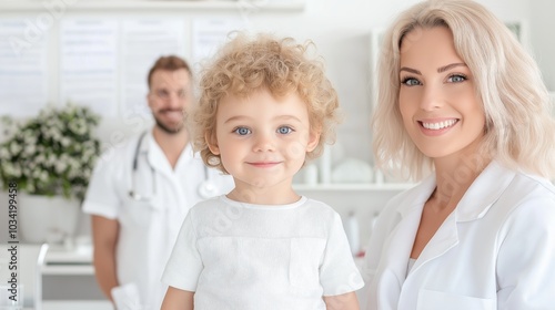 Fototapeta premium Smiling medical professionals with child in a bright healthcare setting